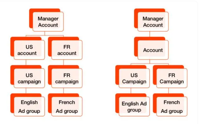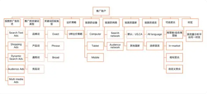 结算方式和账户结构:建议按国家开设账户,按广告类型、产品类型、匹配方式和设备等创建不同的广告系列(Campaign),按词类、使用场景、热销等创建不同的广告组(Ad Group),并配置相应的关键词和广告语。对于非大型站点,可以开设一个账户,并以国家作为创建广告系列的参考维度之一。